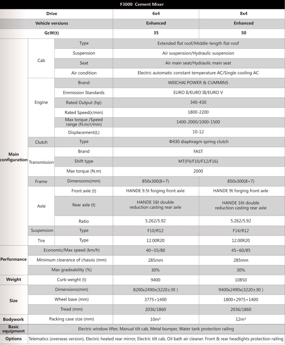 চ্যাসিস এবং পাওয়ার সিস্টেম: শ্যাকম্যান এফ 3000 6x4 এবং 8x4 সিমেন্ট মিক্সার ট্রাক ওয়েইচাই ইঞ্জিন গ্রহণ করে, যার শক্তিশালী শক্তি, উচ্চ টর্ক এবং ভাল ত্বরণ কর্মক্ষমতা রয়েছে। নির্মাণ সাইটে জটিল রাস্তার অবস্থার অধীনে ট্রাকের উত্তরণ এবং স্থিতিশীলতা নিশ্চিত করার জন্য দ্রুত সংক্রমণ এবং ম্যান অ্যাক্সেলের সাথে মিলছে।