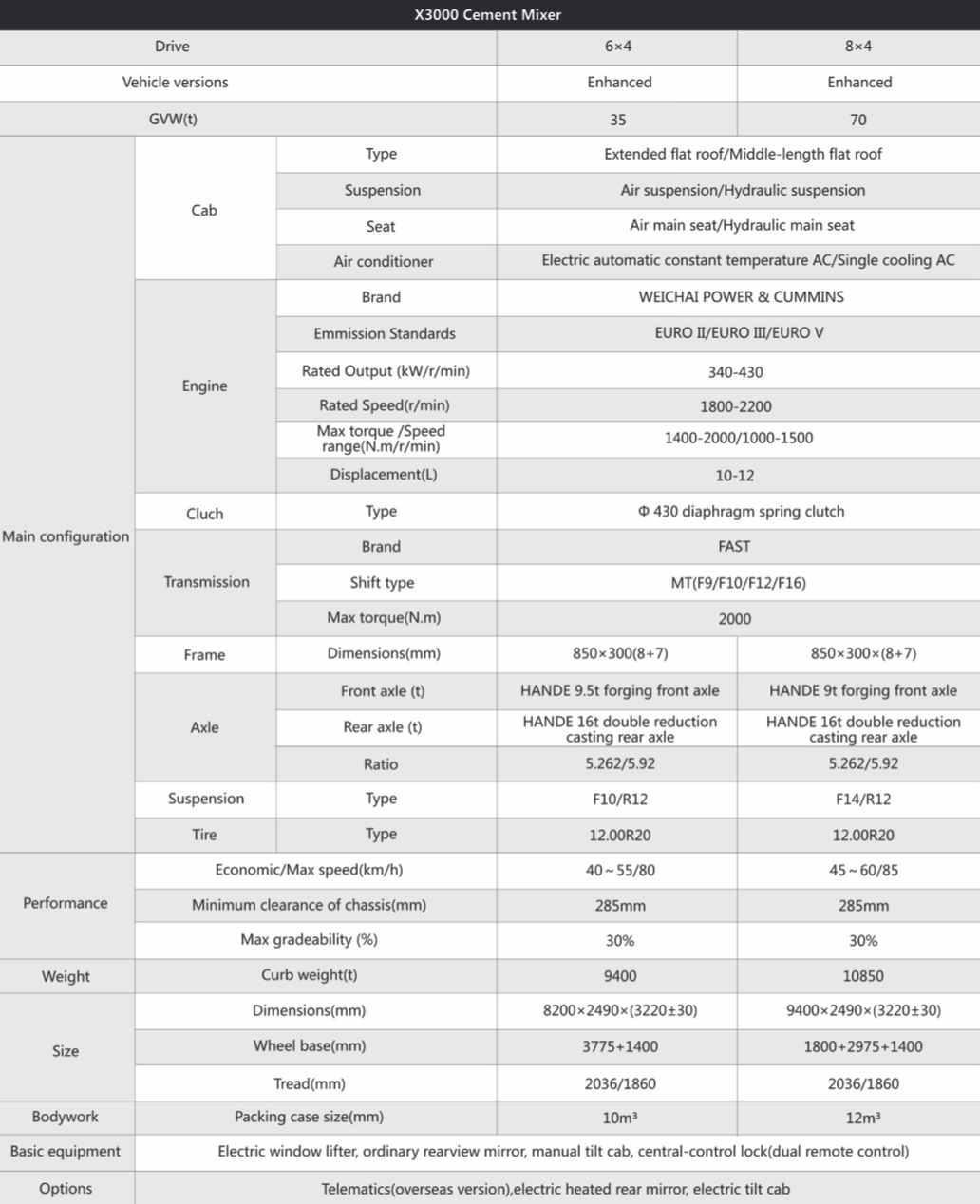শ্যাকম্যান এক্স 3000 মিক্সার ট্রাক একটি দক্ষ ইঞ্জিনিয়ারিং বাহন যা বিশেষত কংক্রিট পরিবহনের জন্য ডিজাইন করা হয়েছে। এটি পেশাদার উচ্চতর যানবাহন উত্পাদন কৌশলগুলির সাথে শ্যাকম্যান ভারী ট্রাকগুলির নির্ভরযোগ্যতা একত্রিত করে। মিক্সিং ট্যাঙ্কটি উচ্চ-শক্তি পরিধান-প্রতিরোধী ইস্পাত প্লেটগুলি দিয়ে তৈরি এবং সাধারণত 8-12 ঘনমিটার ভলিউম হয়। অভ্যন্তরীণ প্রাচীরটি ডাবল হেলিকাল ব্লেডগুলির সাথে ঝালাই করা হয়, পরিবহণের সময় কংক্রিটের অভিন্ন মিশ্রণ নিশ্চিত করে এবং পৃথকীকরণ বা দৃ ification ়তা রোধ করে। ট্যাঙ্কটি একটি হাইড্রোলিক মোটর দ্বারা চালিত হয় এবং উচ্চ সংক্রমণ দক্ষতা এবং মসৃণ অপারেশনের জন্য একটি আমদানি করা রিডুসারের সাথে যুক্ত হয়। এটি 1%এরও কম অবশিষ্টাংশের সাথে এগিয়ে এবং বিপরীত স্রাবকে সমর্থন করে।